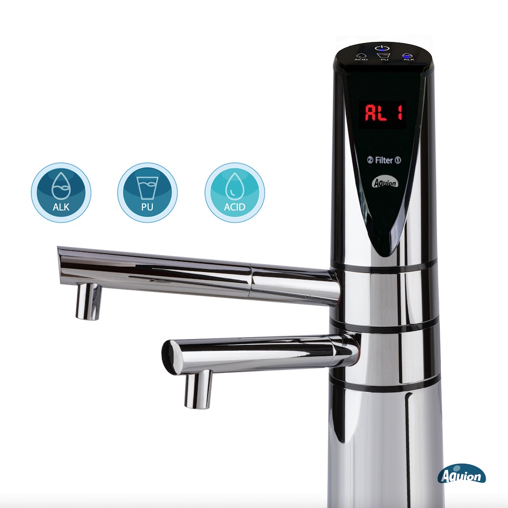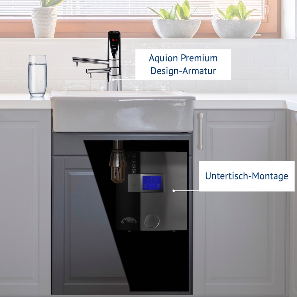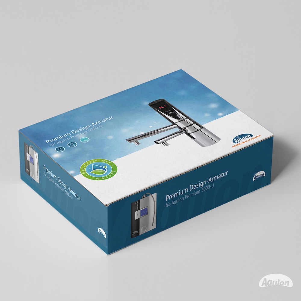 Die Design-Armatur dient der Steuerung des Premium 5000 und perfektioniert dessen Handhabung, wenn er (als 5000-U) als Untertischgerät eingesetzt wird. Daher ist sie im Lieferung des Premium 5000-U enthalten. Für den Fall, dass ein Premium 5000 nachträglich unter der Spüle installiert wird, ist die Design-Armatur separat erhältlich. Sie wird mit einem Flexschlauch mit dem Gerät verbunden. Hinweis: Die Design Armatur ist nicht mit anderen AquionWassersystemen kompatibel.