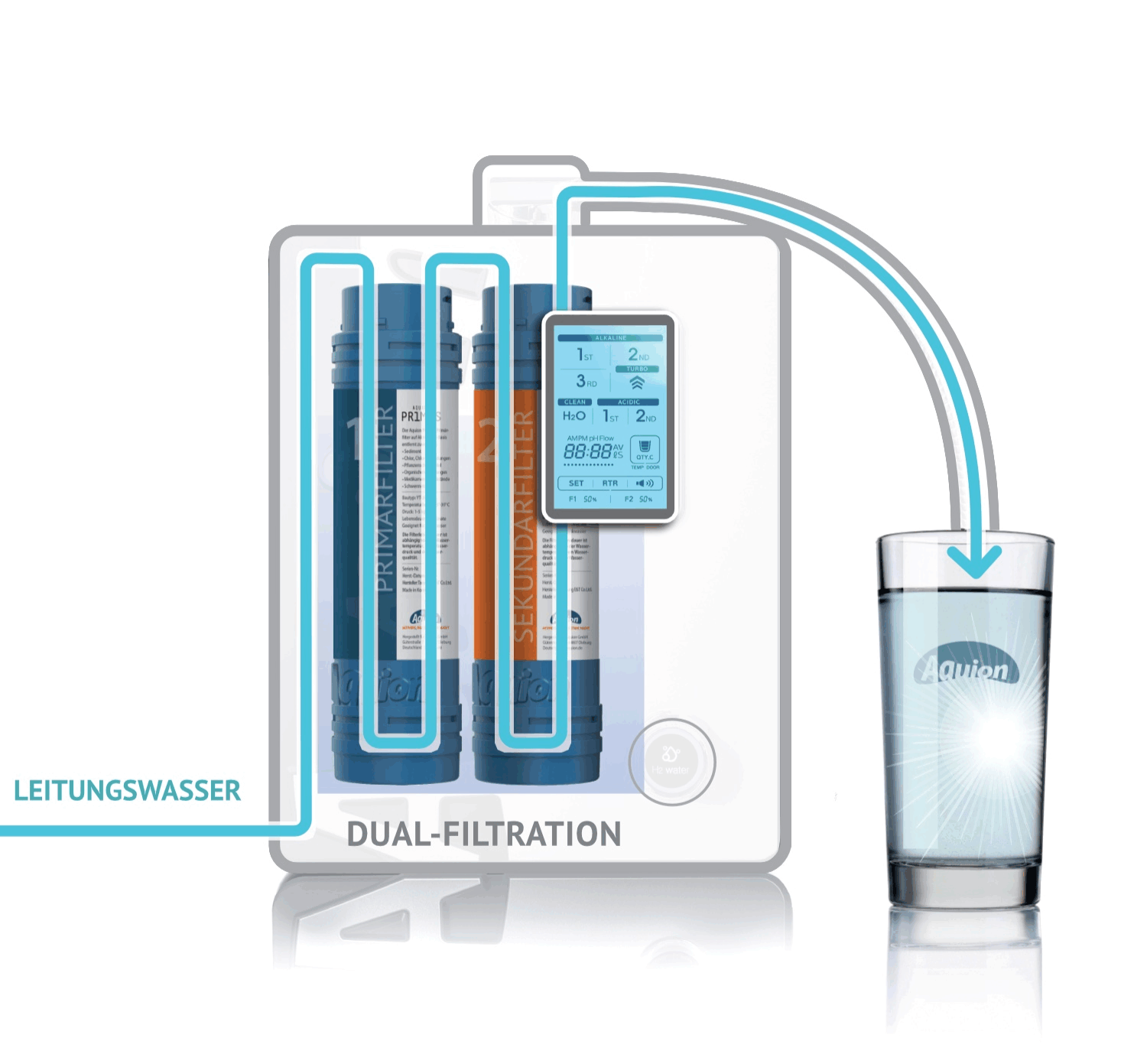 Die allgemeine Sensibilität für gesunde Ernährung und für gut gefiltertes Trinkwasser steigt. Daher sind alle aktuellen Aquion Wassersysteme mit der Aquion Dual-Filtertechnologie ausgestattet. Diese Technologie kombiniert bewährte und innovative Methoden zu einer herausragenden Filterleistung, die man woanders vergeblich sucht.